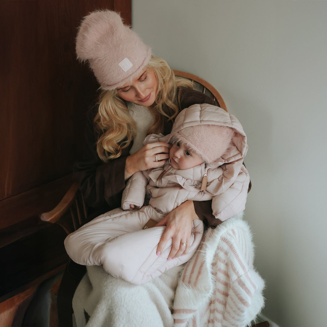 とっても柔らかいニットのブランケットとビーニー。大人からお子様まで家族みんなとりこに。