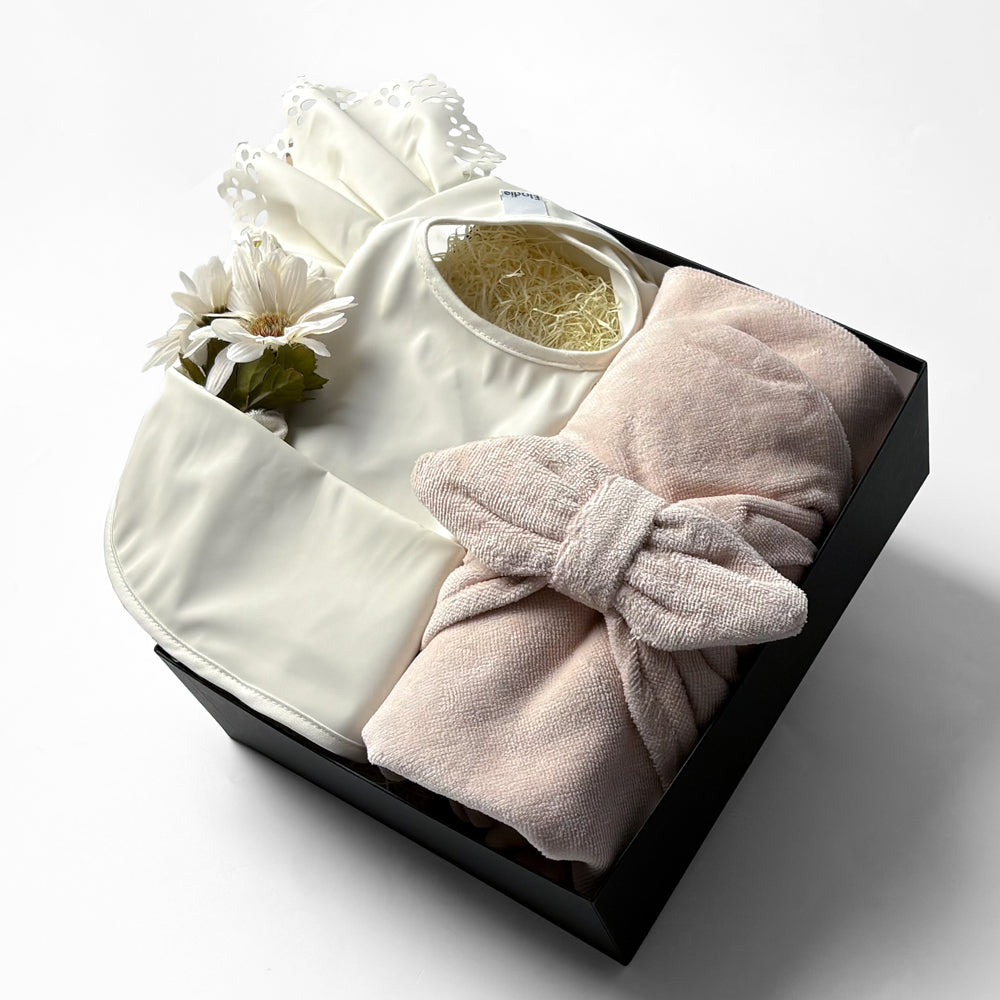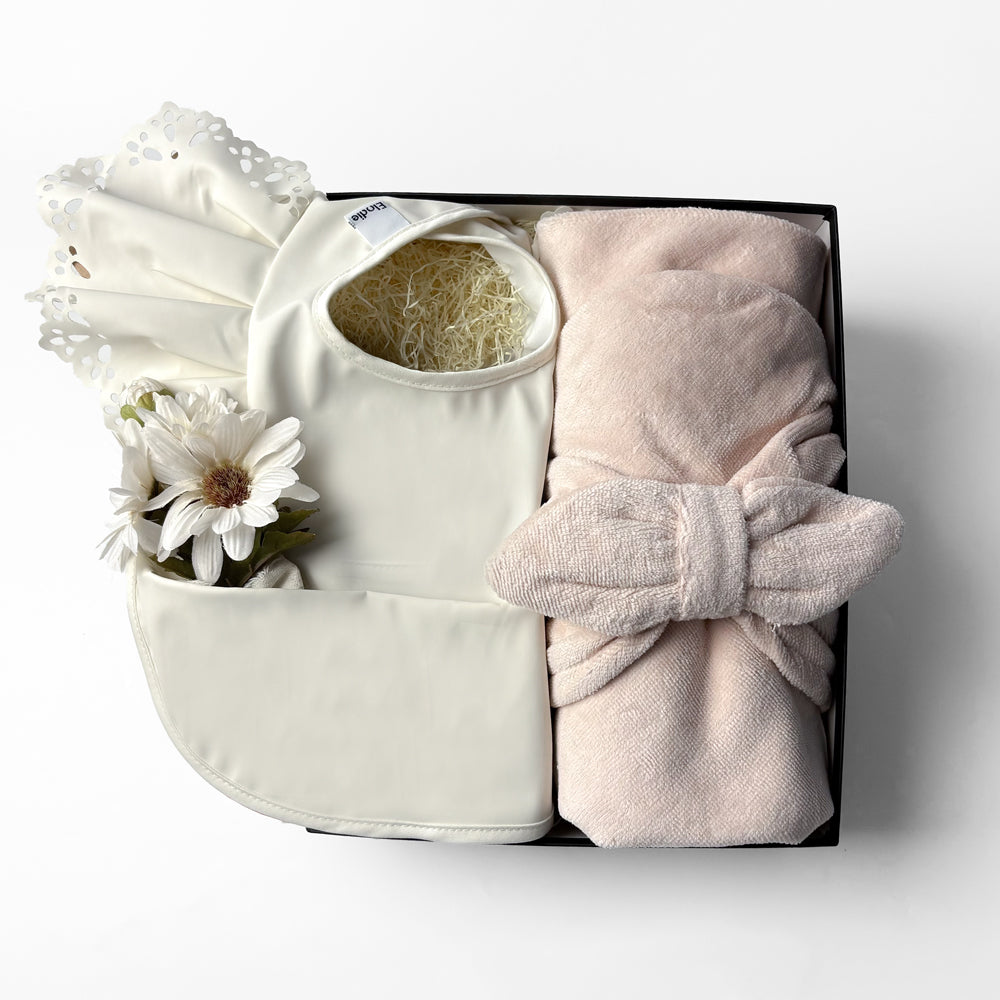 贈り物にお食事エプロンにもらって嬉しいフード付きタオルが入ったギフトセットです。お風呂上がりやお出かけでも大活躍するアイテムをお届けします。出産祝いに人気のアイテムをギフトボックスにお入れてして、リボンをかけてお届けいたします。