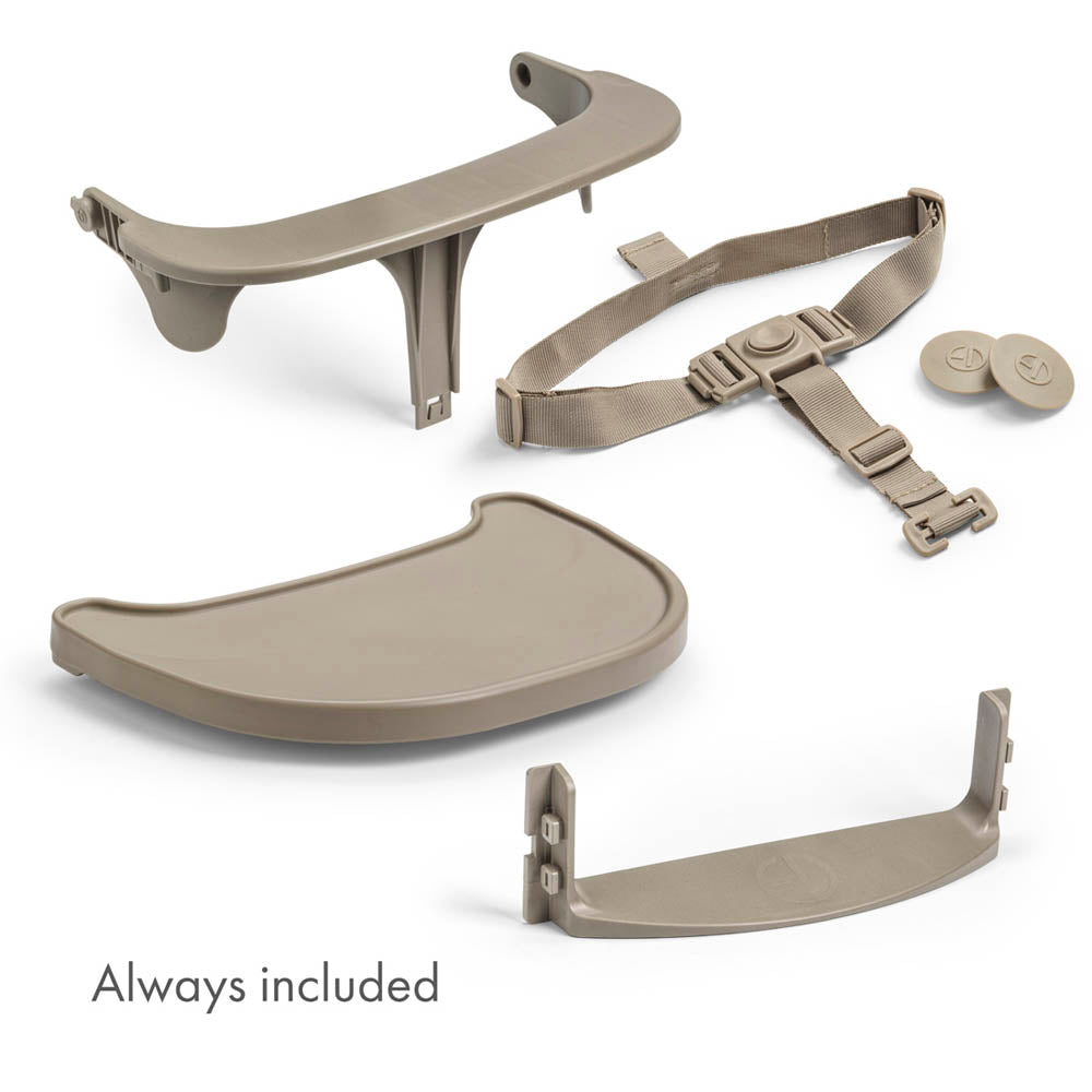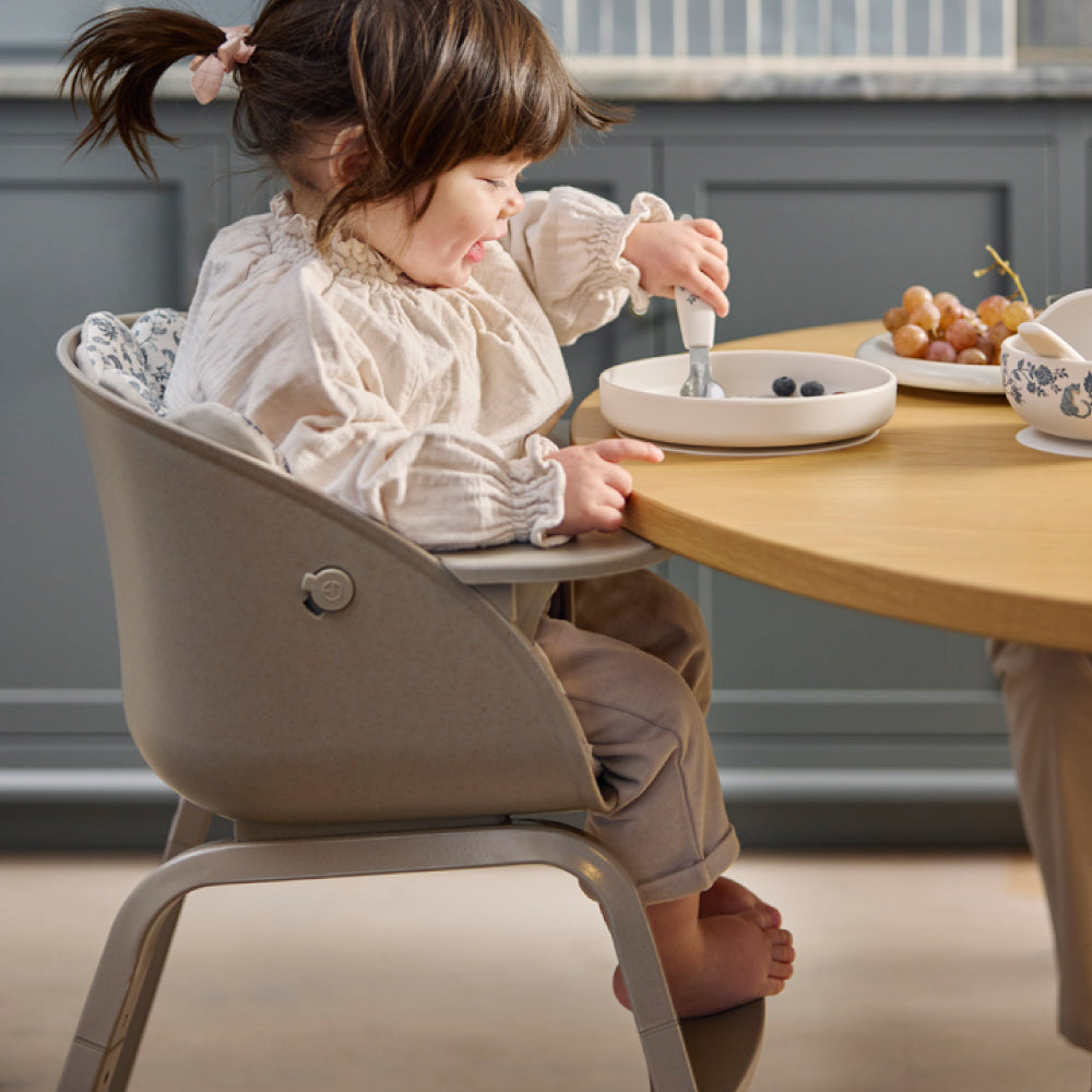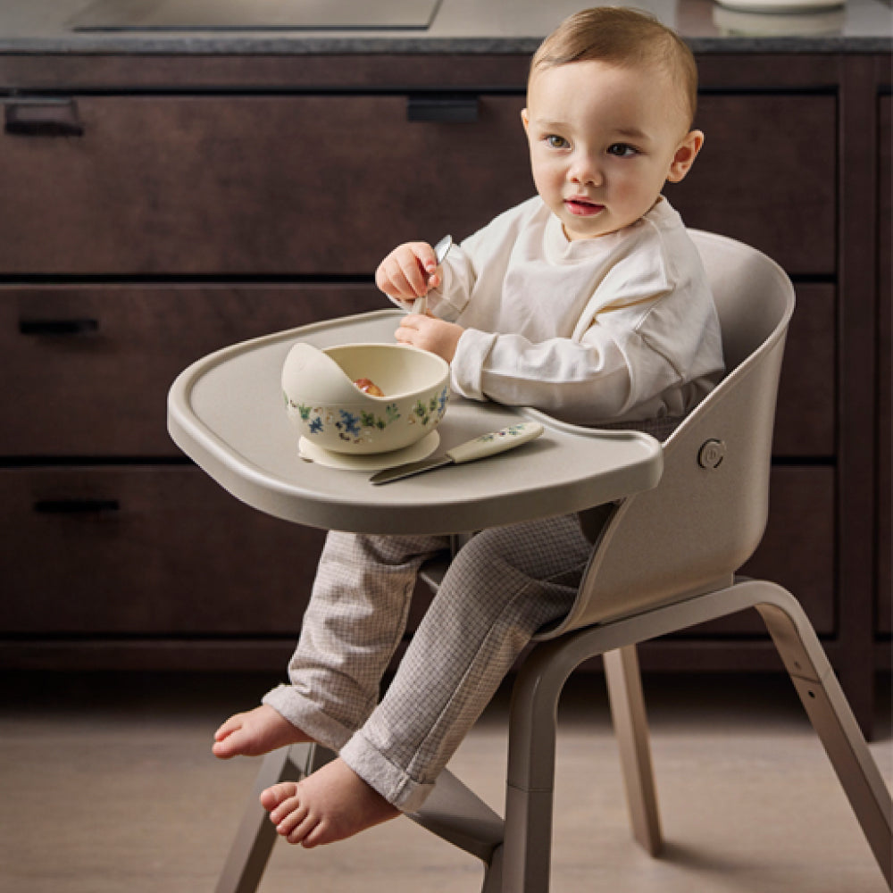 成長に合わせて調節できるフットレストで、最小限のスペースに収まるスマート設計、付属のトレーの着脱も可能、お好みのお食事スタイルでお楽しみいただけます。