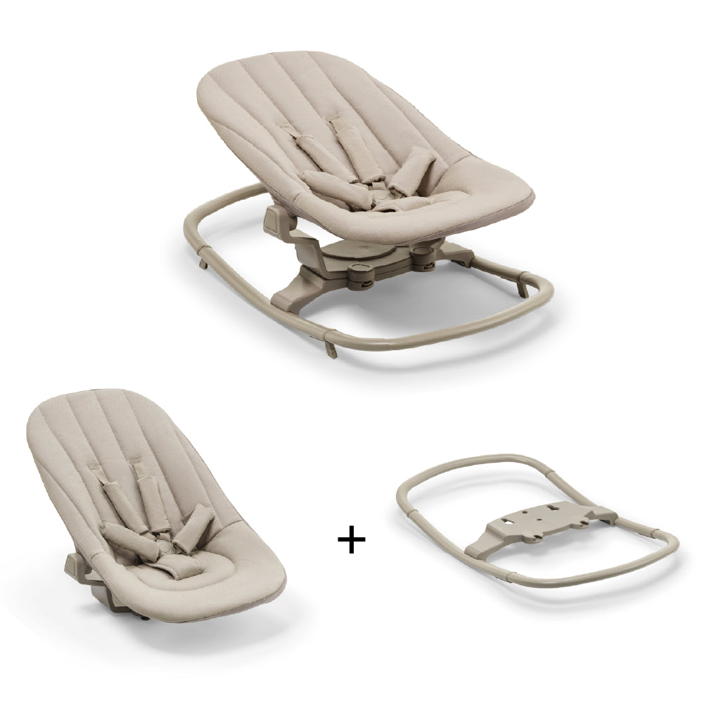 GRACE ハイチェアに取り付けて使えるのはもちろん、別売りのバウンサーフレームを使えば、床に置いてバウンサーとしても使えます。