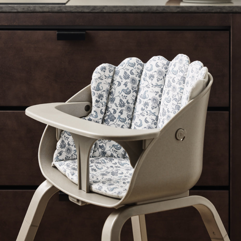 ハイチェアにぴったりフィットする設計で、見た目もすっきり。北欧らしい上品なテキスタイルがインテリアのアクセントにもなり、毎日の食事やおやつの時間を、より心地よく彩ります。