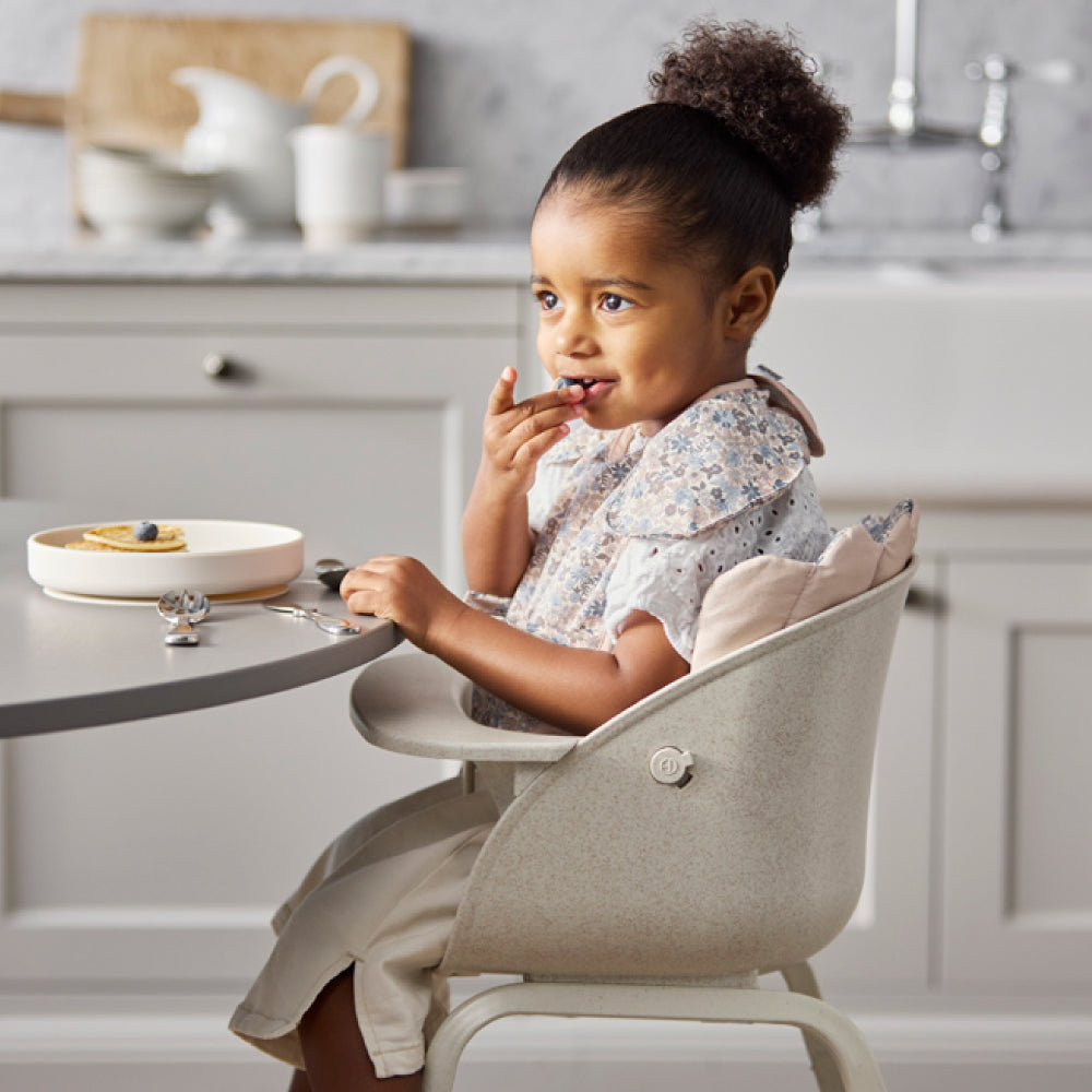 ハイチェアにぴったりフィットする設計で、見た目もすっきり。北欧らしい上品なテキスタイルがインテリアのアクセントにもなり、毎日の食事やおやつの時間を、より心地よく彩ります。