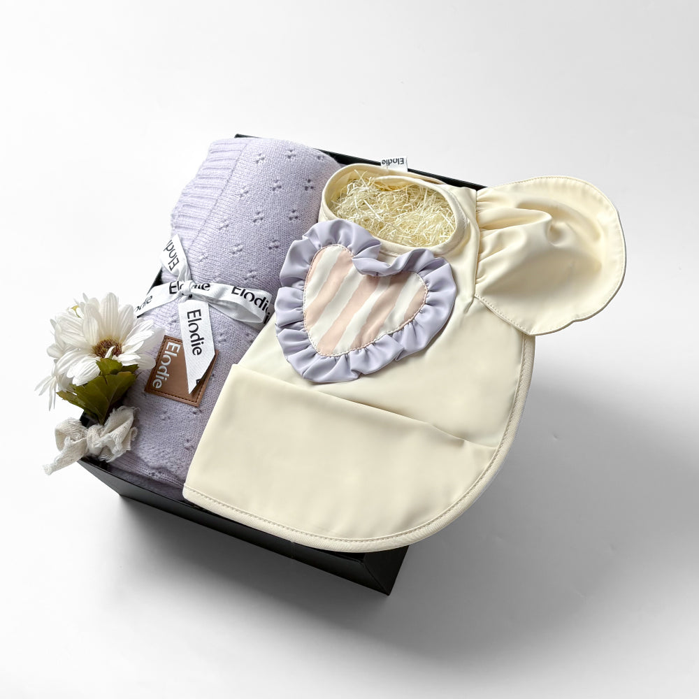 人気の食事エプロンと刺繍のようなデザインが可愛いブランケットがセットになった出産祝いにぴったりなギフトセット。