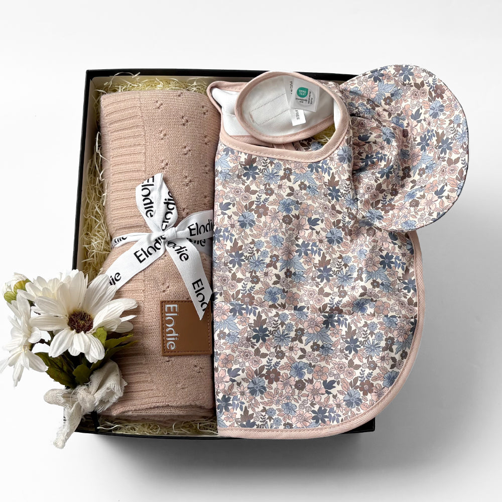 人気の食事エプロンと刺繍のようなデザインが可愛いブランケットがセットになった出産祝いにぴったりなギフトセット。
